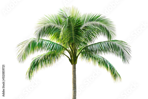 A vibrant, isolated coconut palm tree with lush green leaves against a solid background background removed