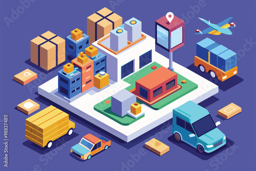 A vibrant isometric depiction showcasing a customizable dropshipping model with vehicles, packages, and a warehouse setup on a simplified landscape.