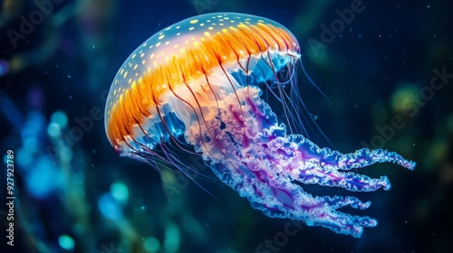 A vibrant jellyfish floating gracefully in a deep blue ocean, showcasing its luminescent tentacles and colorful body against the dark marine backdrop.