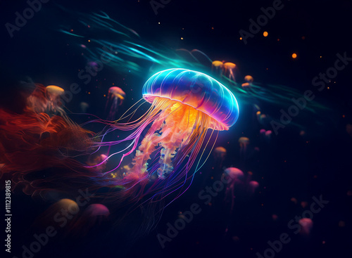 A vibrant jellyfish, glowing with bioluminescent colors, drifts in a dark ocean. Surrounding it are smaller jellyfish and swirling, ethereal light.