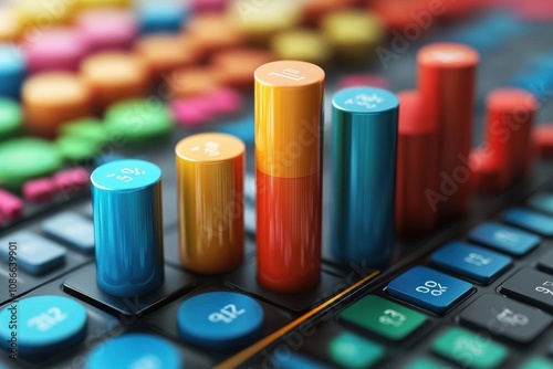 A vibrant keyboard showcases colorful bar graphs, illustrating data analysis and visualization in a creative way.