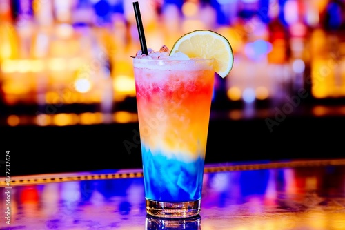 A vibrant layered cocktail garnished with a lemon slice and a straw.