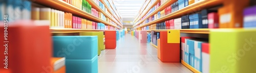 A vibrant library aisle filled with colorful books and organized shelves, inviting readers to explore and discover knowledge.