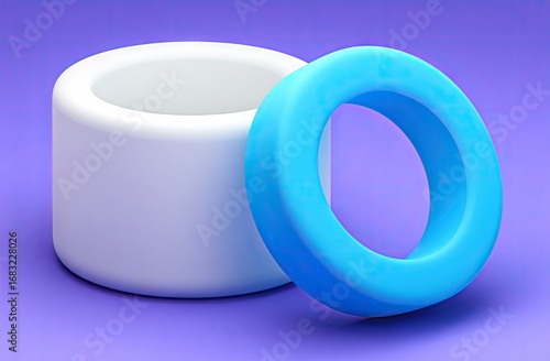 A vibrant, light blue ring overlaps a large, smooth white cylinder on a muted lavender background.