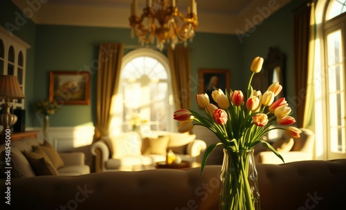 A vibrant living room bathed in the golden light of spring features a plush design sofa elegant furniture and a vase overflowing with delicate tulips adding a touch of easter cheer to the home decor A