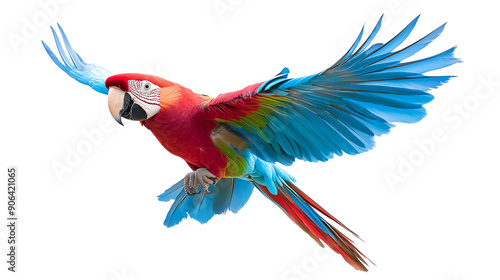 A vibrant macaw parrot gracefully flying with stunning blue and red feathers, showcasing its beauty in mid-air.