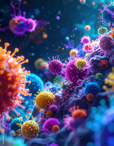 A Vibrant Macro-Art of the Human Microbiome, Depicting Microorganisms as a Colorful and Luminous Alien Galaxy