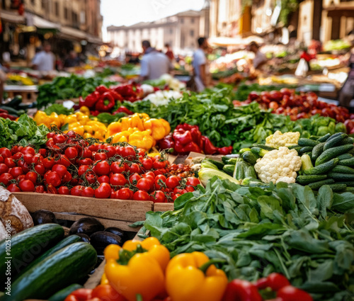 A Vibrant Market Scene In Tuscany, With Stalls Displaying Fresh Vegetables, Herbs, And Local Specialties Like Tuscan Bread And Artisanal Oils, With Shoppers Interacting