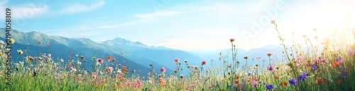 A vibrant meadow filled with colorful flowers under a bright blue sky and mountains.