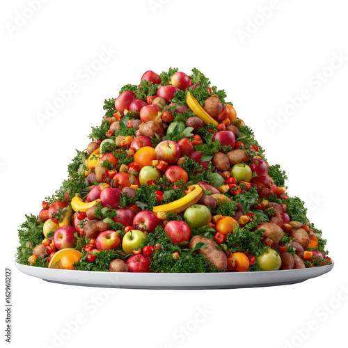A vibrant mountain of fresh fruits and vegetables, including apples, bananas, tomatoes, potatoes, oranges, and kale, piled high on a white plate isolated on transparent background