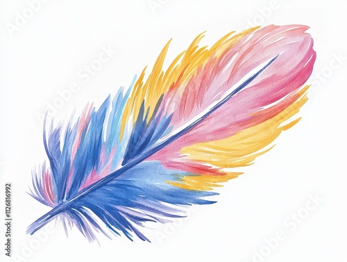 A vibrant, multicolored feather painted in shades of blue, pink, and yellow, showcasing artistic brush strokes and fluidity.