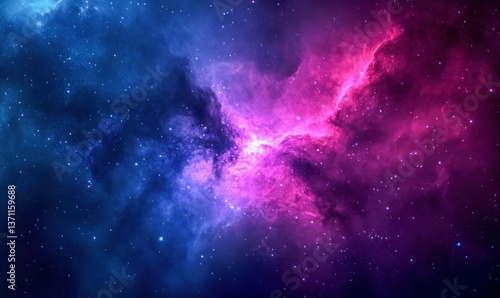 A vibrant nebula glows in shades of pink and purple, set against a backdrop of distant stars.