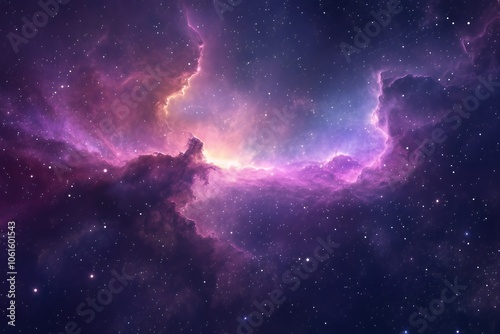 A vibrant nebula in space, a cosmic cloud of gas and dust glowing in a mix of pink, purple, and yellow hues, with scattered stars against a dark blue background.