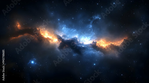 A vibrant nebula of orange and blue glows in the vast expanse of space, surrounded by twinkling stars.