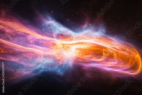 A vibrant nebula swirls in space, displaying a cosmic dance of fiery orange and cool blue hues.