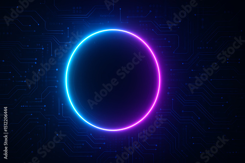 A vibrant neon circle illuminated in blue and pink, set against a dark circuit background. The design symbolizes innovation and digital advancement in modern technology.