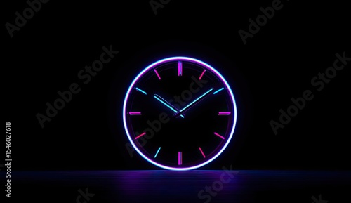A vibrant neon clock with pink and teal illumination glows against a stark black background. Its simple design emphasizes the passage of time
