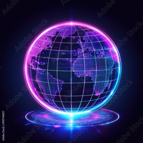 A vibrant, neon globe in a futuristic design, showcasing a digital world map with glowing continents.