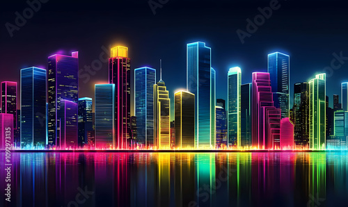 A vibrant neon skyline reflecting on water, showcasing modern architecture and urban life.