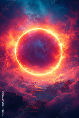 A vibrant neon vortex with layered geometric concentric shapes, creating a dynamic, abstract visual effect,