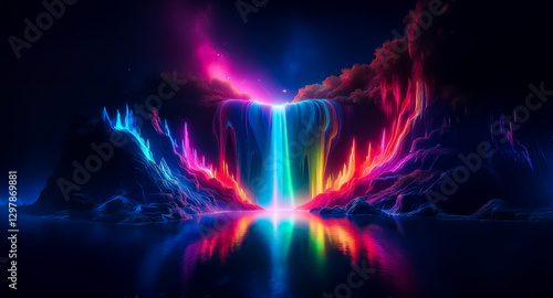 A vibrant neon waterfall cascades in the dark of night. Colorful lights illuminate the rocks and water creating a fantastical, dreamlike scene with reflections.