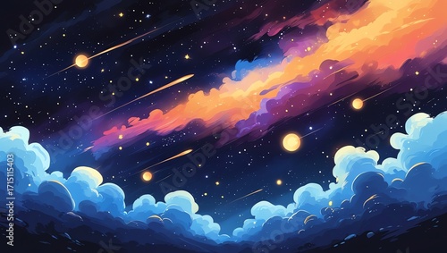 A vibrant night sky filled with shooting stars and colorful clouds