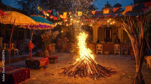A vibrant nighttime bonfire celebration featuring colorful flags, illuminated decorations, and a festive atmosphere, capturing cultural traditions.