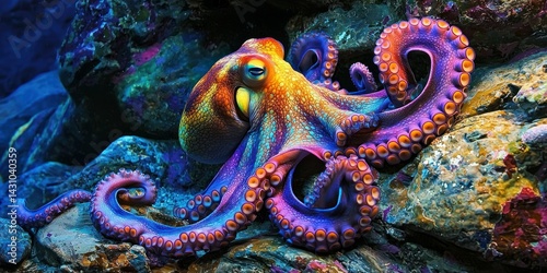 A vibrant octopus changing colors while resting on a rocky ocean floor, blending in with the surroundings