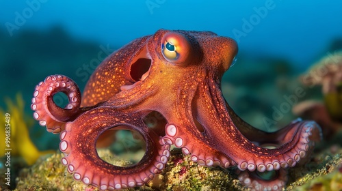 A vibrant octopus gracefully moves through its underwater habitat, showcasing its rich colors and unique morphology.