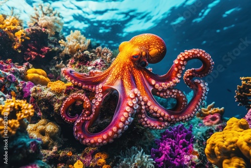 A Vibrant Octopus in a Colorful Coral Reef Environment Captured Underwater