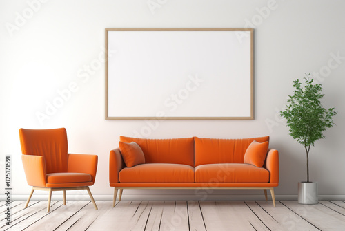 A vibrant orange armchair in a sleek living room with minimalistic furniture and an empty white frame mockup as a focal point.