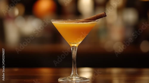 A vibrant, orange cocktail, crafted with the sweetness of pumpkin and the sophistication of vodka, garnished with a cinnamon stick, promising a taste of fall in every sip.