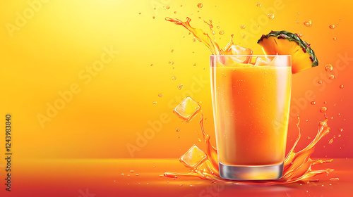 A vibrant orange drink splashes out of a glass, surrounded by ice, set against a warm, gradient background.