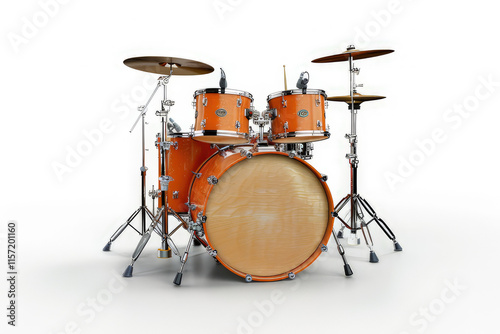 A vibrant orange drum set positioned on a white background, designed for music performance. isolated on white background