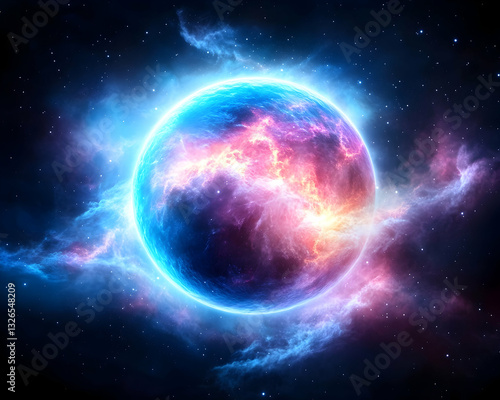 A vibrant, otherworldly planet surrounded by swirling nebulae