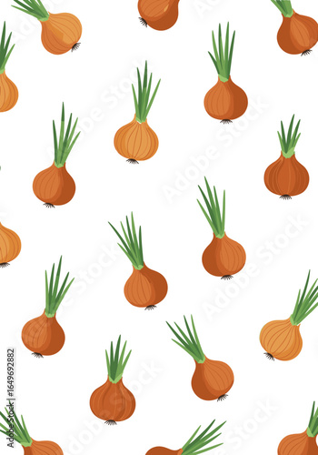 A vibrant pattern of fresh yellow onions with green shoots on a clean white background