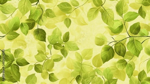 A vibrant pattern of green leaves on a soft yellow background, ideal for nature-themed designs.