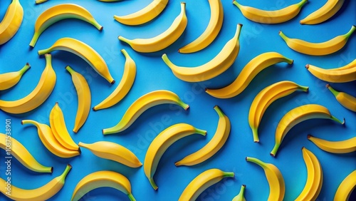 A vibrant pattern of yellow bananas arranged on a bright blue background, showcasing the contrasting colors and organic shapes.