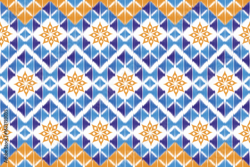 A vibrant pattern with diamond shapes in blue and orange tones, accented by golden floral star motifs. The design blends traditional weaving style with a fresh, decorative touch.