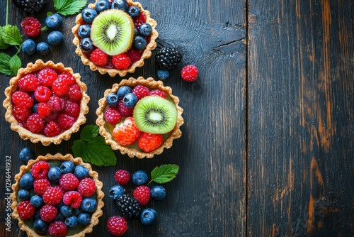 A vibrant photo of a fruit tart with colorful berries and kiwi slices arranged on a creamy filling, set on a rustic wooden table