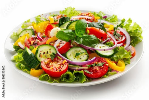 A vibrant plate of assorted vegetables including tomatoes, cucumbers, bell peppers, and carrots, arranged neatly on a white table.