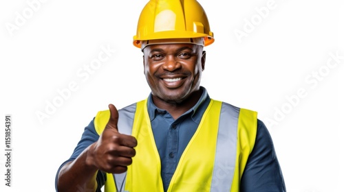 A vibrant portrait of a construction worker in a yellow hard hat, beaming with positivity and giving a confident thumbs up, set against a crisp white backdrop