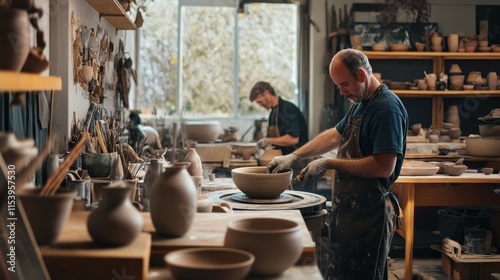 A vibrant pottery studio with pottery wheels and clay sculptures, Potters shaping intricate designs with focused intensity, Documentary photography style