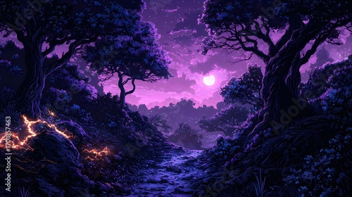 A vibrant, purple landscape at night, with glowing rocks and ancient trees, bathed in the soft glow of a full moon.