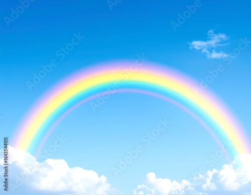 A vibrant rainbow arches across a clear blue sky with fluffy clouds