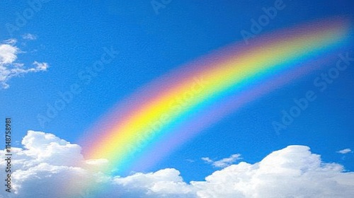 A vibrant rainbow arcs across a clear blue sky with fluffy white clouds, a symbol of hope and promise.
