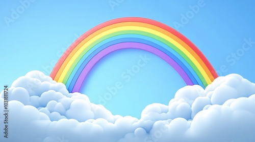 A vibrant rainbow arcs gracefully across a clear blue sky, framed by fluffy white clouds, creating a serene and uplifting natural scene.