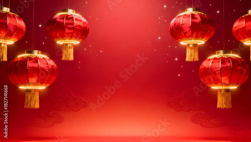 A vibrant red background adorned with traditional Chinese lanterns, creating a festive and celebratory atmosphere.