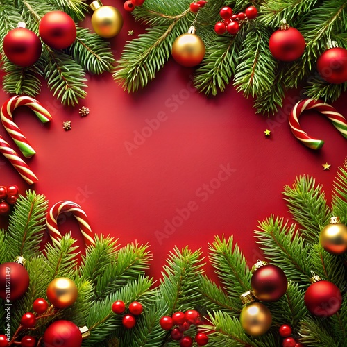A vibrant red background with a festive top border of Christmas tree branches, ornaments, and candy canes.