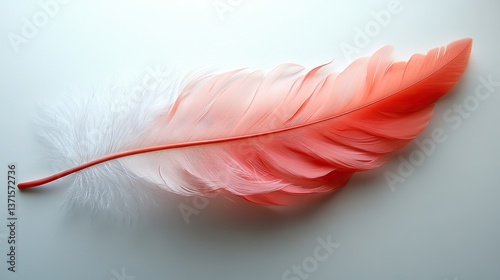 A vibrant red feather floats gracefully against a minimalist white backdrop, embodying freedom, lightness, and delicate beauty, creating a striking contrast.
